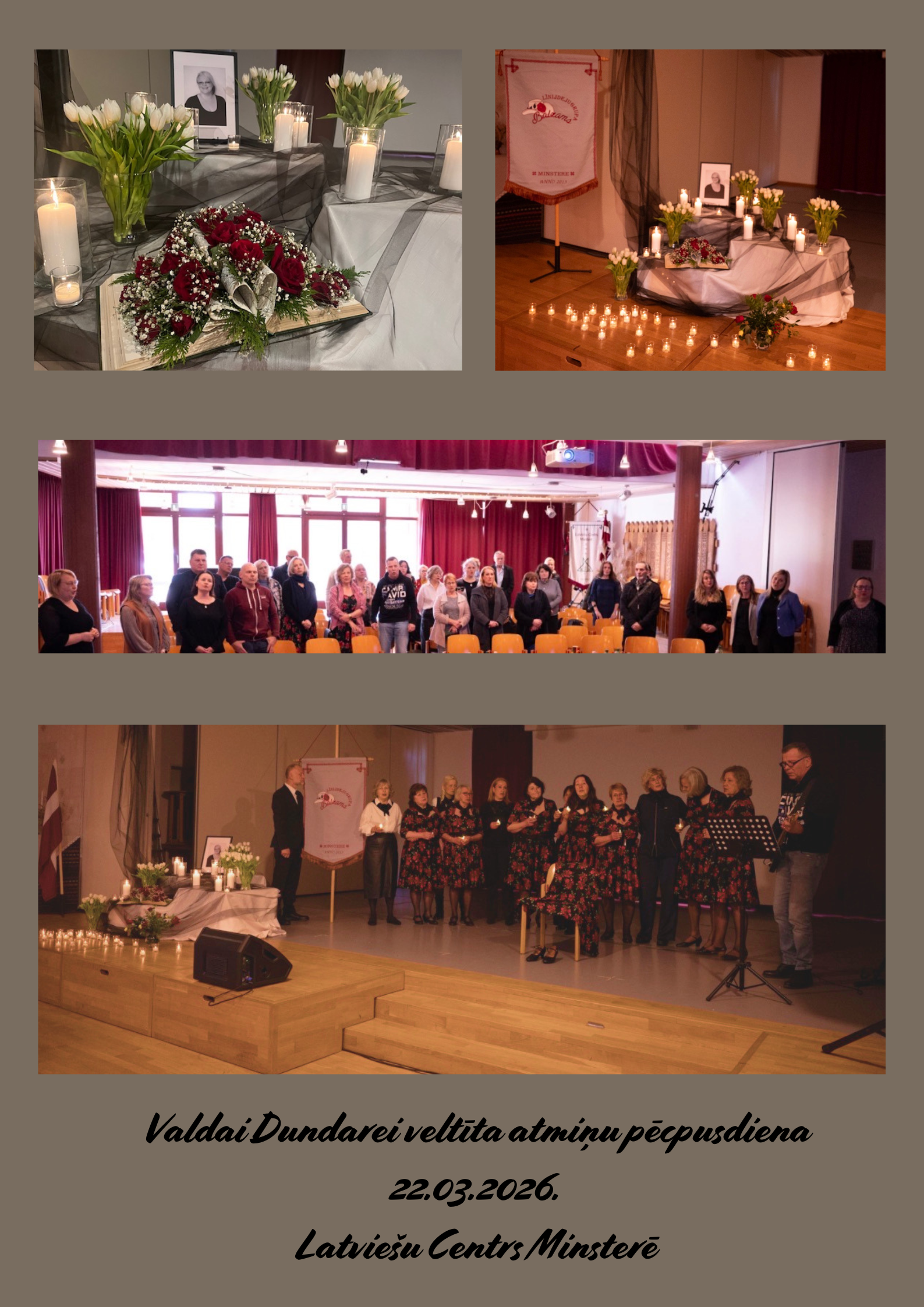 Atmiņu ir tik daudz Tās visas mūs kopā sauc. Latviešu Centrs Minsterē (LCM) aicināja svētdien, 22. martā, uz Valdai Dundarei (19652026) veltītu atmiņu pēcpusdienu. Valda bija ilggadēja LCM valdes locekle, bijusī nedēļas nogales skoliņas vadītāja, kā arī līnijdeju grupas Balzams dibinātāja un vadītāja cilvēks ar lielu sirdi, kas vienmēr aktīvi veidoja un stiprināja visu LCM saimi.