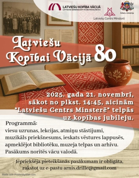 Latviešu Kopība Vācijā (LKV) ir vecākā pēckara trimdas latviešu sabiedriskā organizācija, kuras pamatakmens likts 1945. gada 15. augustā. Šogad LKV svin 80 gadu jubileju un svinības norisināsies Latviešu Centrs Minsterē / Lettisches Centrum Münster e.V. telpās.