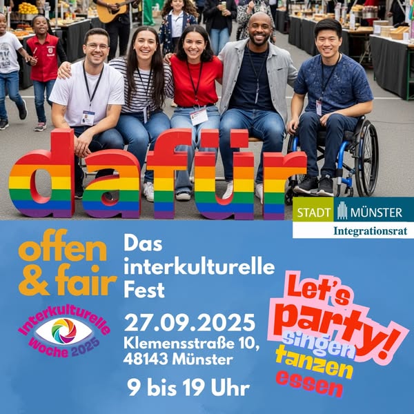 Cik daudzveidīga, sirsnīga un dzīvespriecīga ir Minstere, atkal būs redzams sestdien, 27. septembrī, Interkulturālajos svētkos. Vairāku stundu garā programma ar mūziku, dejām, stāstiem un gardumiem piesaista ik gadu daudzus klausītājus un skatītājus. Kā iepriekšējos gados, tā arī šoreiz tur uzstāsies Minsteres latviešu bērnu ansamblis Do-Re-Mi" un Minsteres bērnu un jauniešu tautas deju kopa "Rudzupuķe". Sestdien plkst. 10.00 viņi kāps uz skatuves starp "Karstadt" un "Galeria Kaufhof" un piesaistīs skatītāju uzmanību ar savu enerģiju un košajiem tautastērpiem.